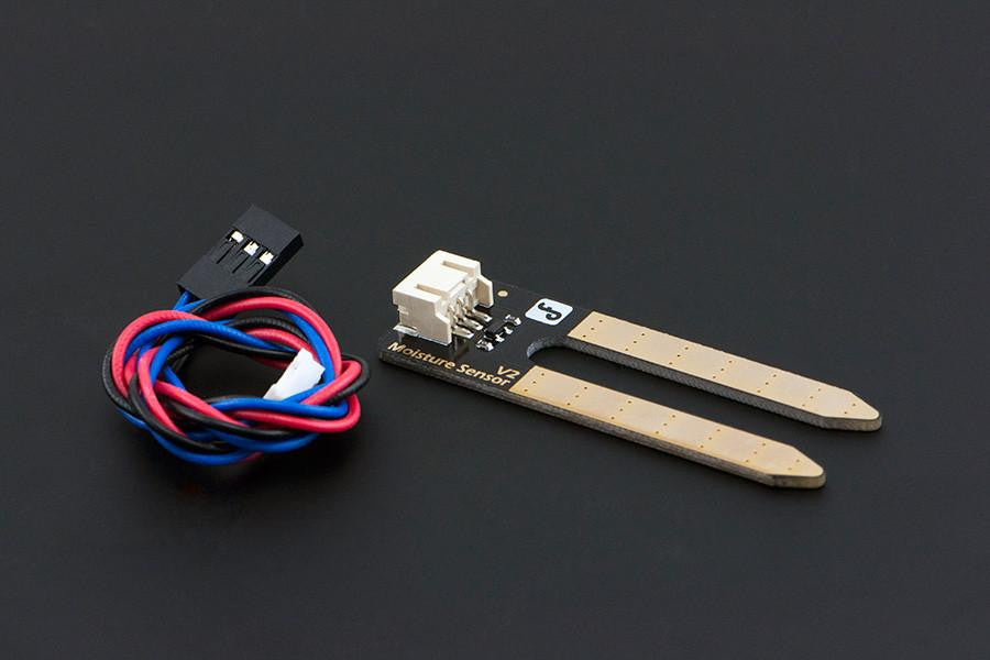 This sensor uses the two probes to pass current through the soil, and then it reads that resistance to get the moisture level. More water makes the soil conduct electricity more easily (less resistance), while dry soil conducts electricity poorly (more resistance).