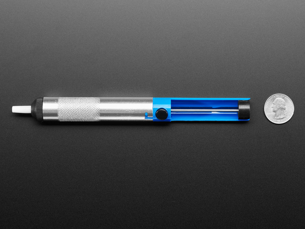 To use, depress the end to engage the vacuum. Then heat up the to-be-desoldered joint until it is liquid. With your other hand hold the plastic tip as close as possible to the joint and depress the button to suck up all the liquid solder. If necessary, clean up the remaining solder with wick.