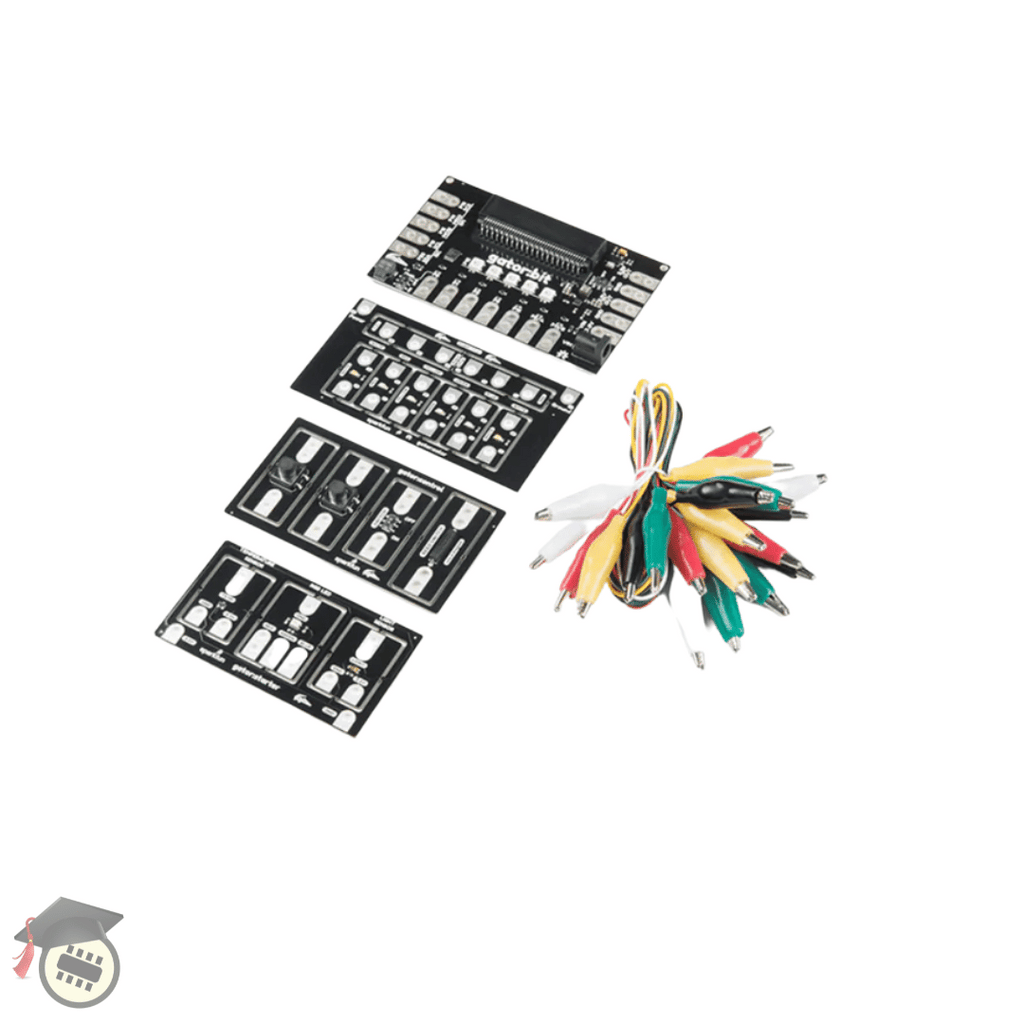 Inside this kit you will find a gator:microphone audio board, gator:UV ultraviolet sensor, gator:soil moisture sensor, gator:environment CCS811 and BME280 sensor, gator:particle biometric sensor, gator:RTC (real time clock), and gator:log data logger. Additionally, we've also included a SparkFun gator:bit V2.0, alligator cables, and a 1GB microSD card and USB adapter! This all-in-one kit makes it easy to add sensors to micro:bits in the classroom or educational setting, just add micro:bits.