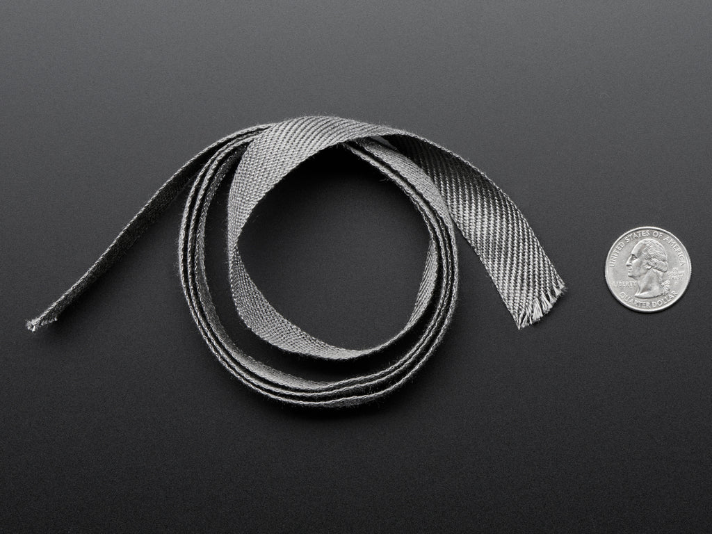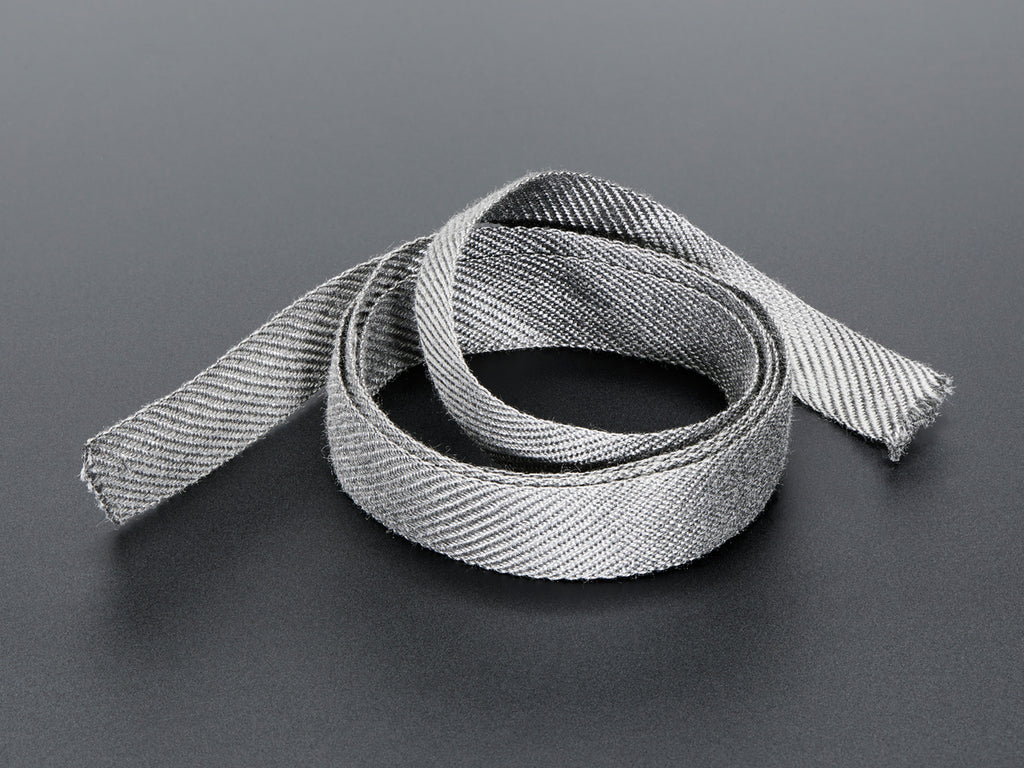 This woven conductive ribbon is great for powering lots of LEDs in a wearable project. It's thin, strong, smooth, and made completely of 316L stainless steel. It plays nice with our stainless conductive thread and is very flexible, just like textile ribbon.