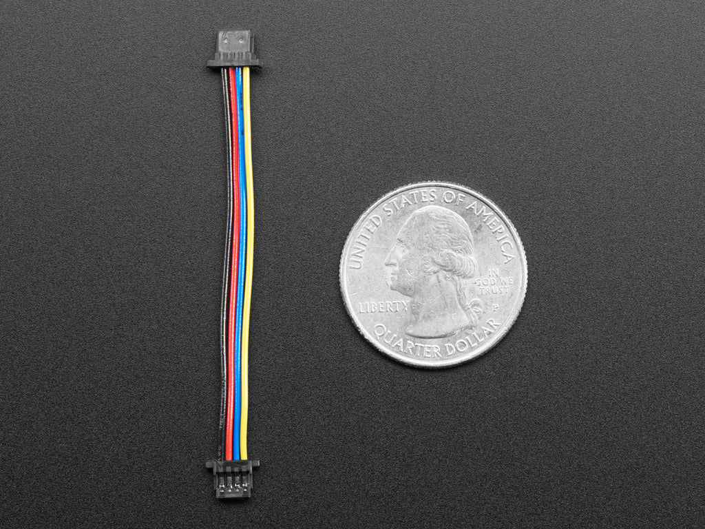 This 4-wire cable is 50mm / 1.9" long and fitted with JST SH female 4-pin connectors on both ends. Compared with the chunkier JST PH these are 1mm pitch instead of 2mm, but still have a nice latching feel, while being easy to insert and remove.