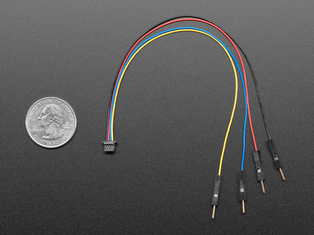 This 4-wire cable is a little over 150mm / 6" long and fitted with JST-SH female 4-pin connectors on one end and premium Dupont male headers on the other. Compared with the chunkier JST-PH these are 1mm pitch instead of 2mm, but still have a nice latching feel, while being easy to insert and remove.