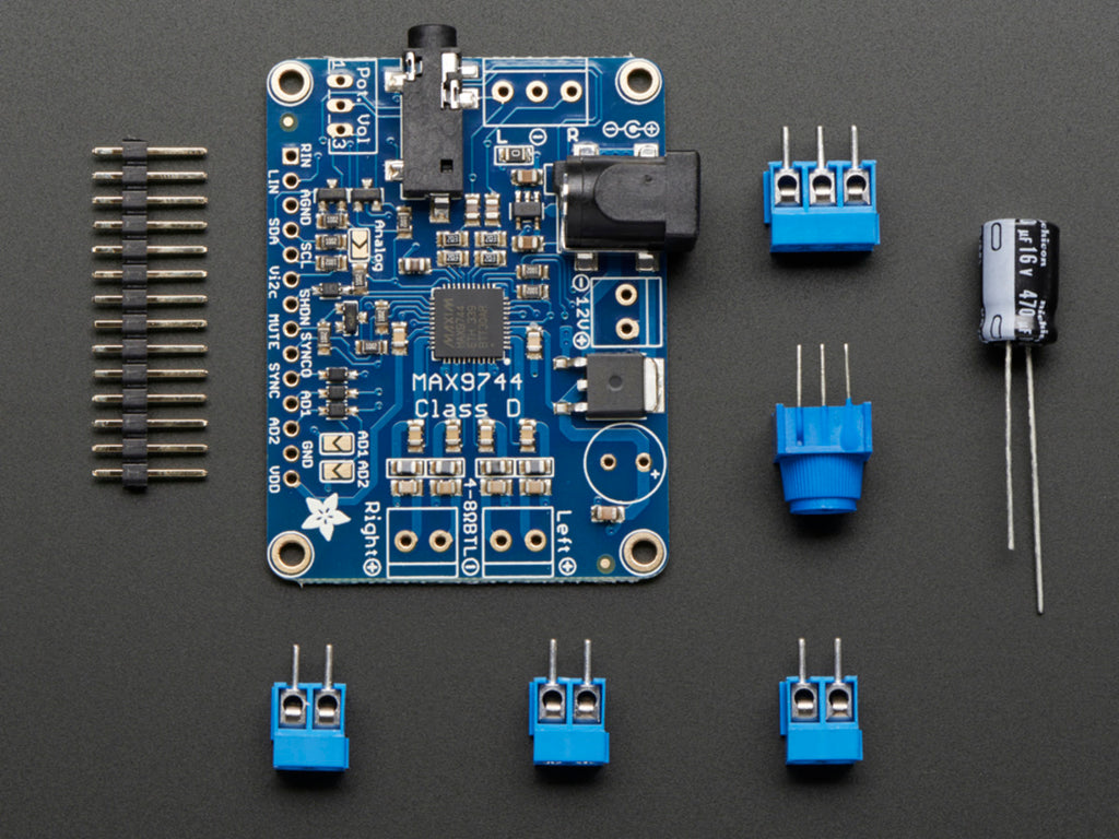 We like the MAX9744 amplifier at the heart of this board because its very easy to use, but it also has both analog and digital volume control capability. Use a single 1KΩ pot (we include one) to adjust volume analog-style. Or hook it up to your favorite microcontroller and send I2C commands to set 64-steps of volume amplification.
