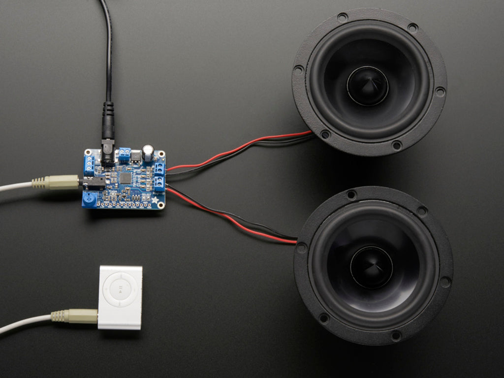 Pump up the volume with this 20W stereo amplifier! This slim little board has a class D amplifier onboard that can drive 2 channels of 4-8 ohm impedance speakers at 20W each. Power it with 5-12VDC using the onboard DC power jack and plug stereo line level into the 3.5mm stereo headphone jack and jam out with ease. Since it's class D, its completely cool-running, no heat sinks are required and it's extremely efficient - up to 93% efficiency makes it great for portable or battery powered rigs.