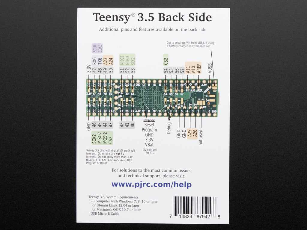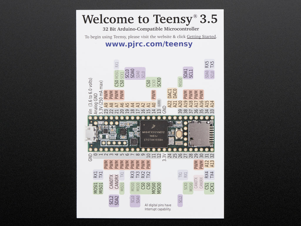 Version 3.5 features a 32 bit 120 MHz ARM Cortex-M4 processor with floating point unit. All digital pins are 5 volt tolerant. The unique specs for the 3.5 are: