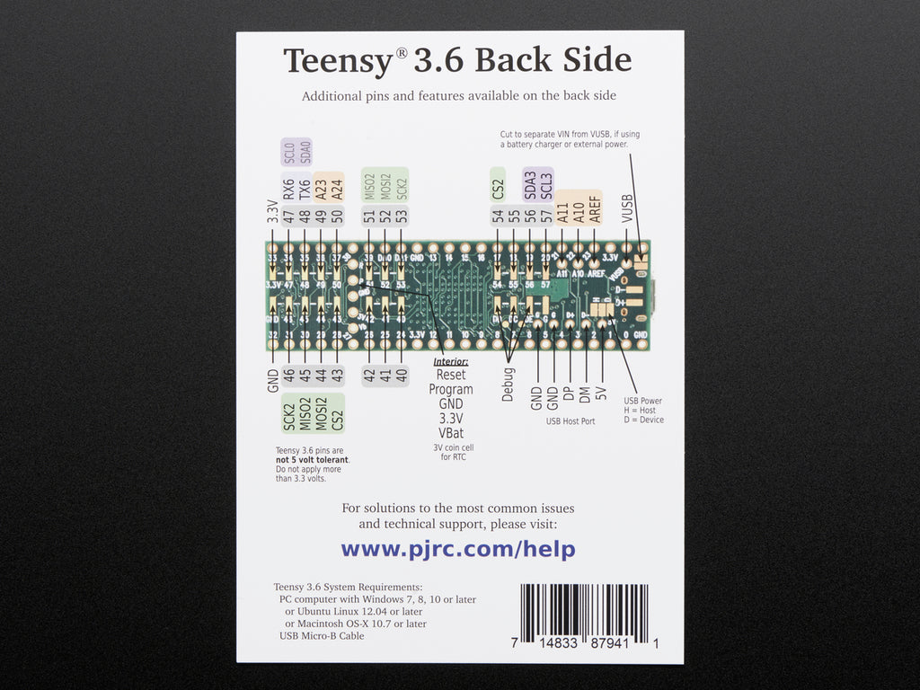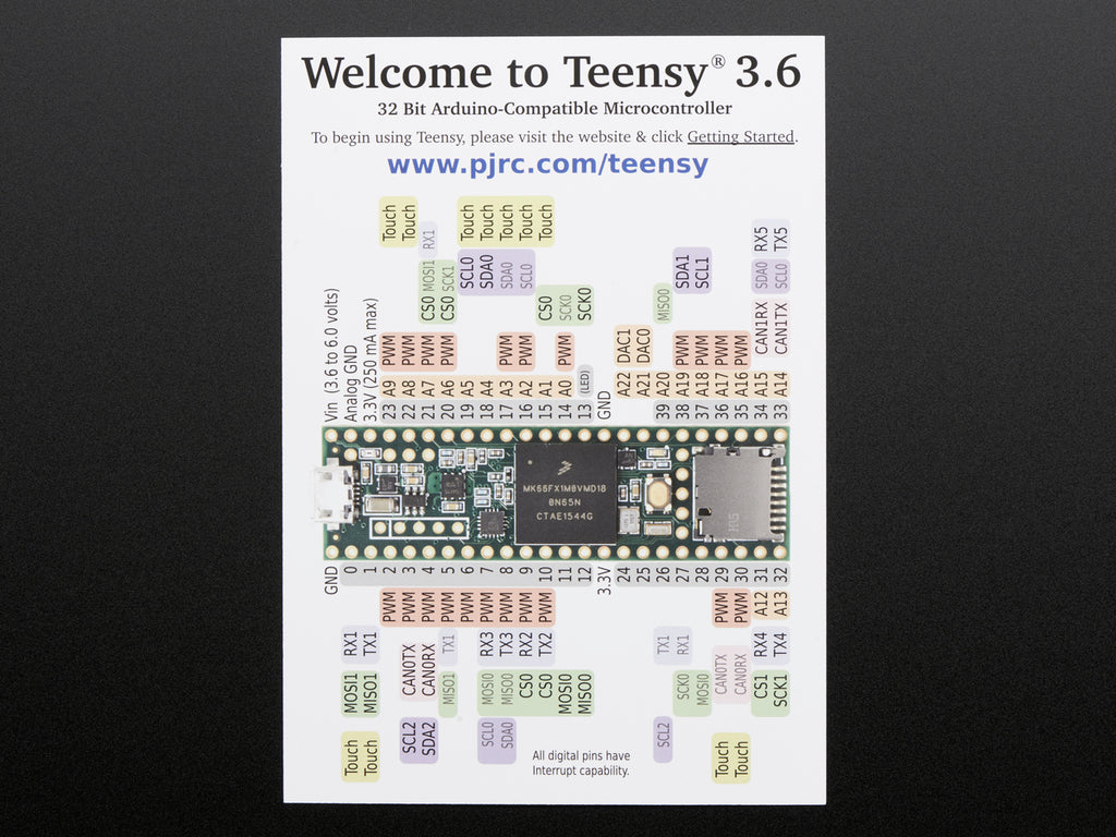 Version 3.6 features a 32 bit 180 MHz ARM Cortex-M4 processor with floating point unit. All digital and analog pins are 3.3 volts. Do not apply more than 3.3V to any signal pin. The unique specs for the 3.6 are: