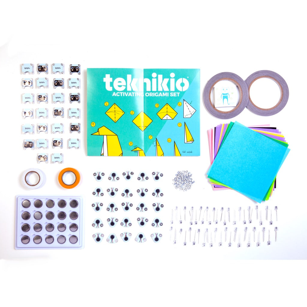21x Teknikio motor board 21x Teknikio battery board 40x batteries 100x LED lights 200x fasteners 2x rolls of conductive tape 1x roll electrical tape 240x sheets of origami paper