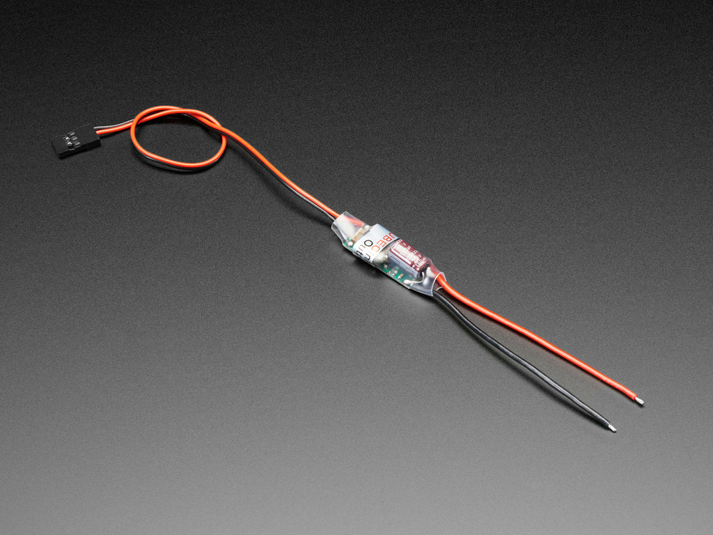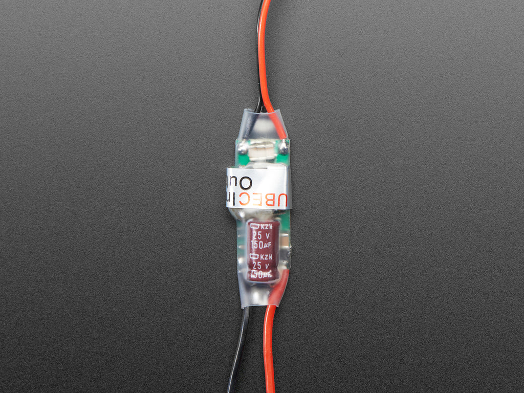 To use, connect 6V up to 16V (recommended) to the IN-side wires and 5V will be generated on the OUT-side wires. You'll get 5V (+-5%) regulated output from higher voltage input. 3A output current, 5A peak - if you're trying to draw 3A you'll need to give it a little more than 6V though, 7V works well. The UBEC has built in filter capacitors on the input and output, but its a switching supply so its a little noisy compared to a linear regulator.