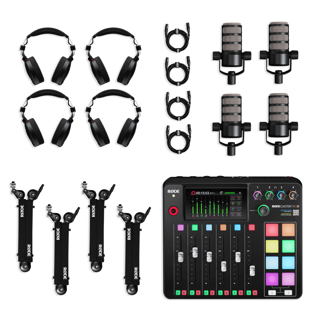 It includes four PodMic broadcast-quality dynamic microphones, PSA1+ professional studio arms, NTH-100 professional studio headphones and the RØDECaster Pro II – the world’s most powerful all-in-one production solution.