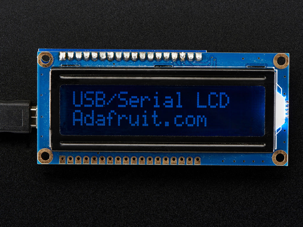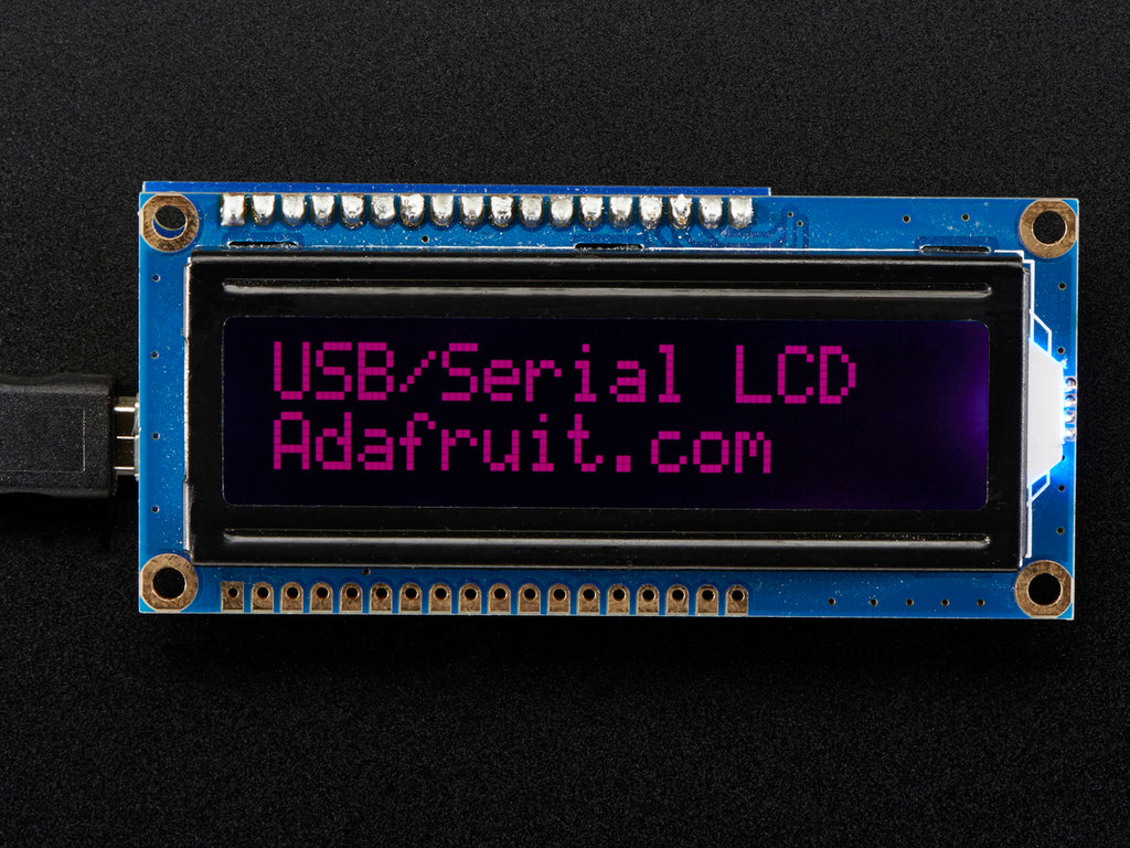 Adding a character display to your project or computer has never been easier with the new Adafruit USB or TTL serial backpack! This custom-designed PCB sits on the back of our 'standard' character LCD (16x2 or 20x4 sized) and does everything you could want: printing text, automatic scrolling, setting the backlight, adjusting contrast, making custom characters, turning on and off the cursor, etc. It can even handle our RGB backlight LCDs with full 8-bit PWM control of the backlight. That means you can change the background color to anything you want - red, green, blue, pink, white, purple yellow, teal, salmon, chartreuse, or just leave it off for a neutral background.