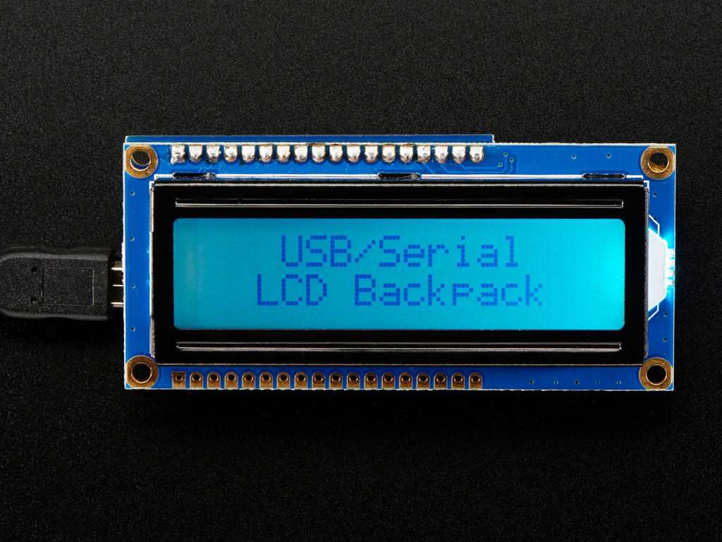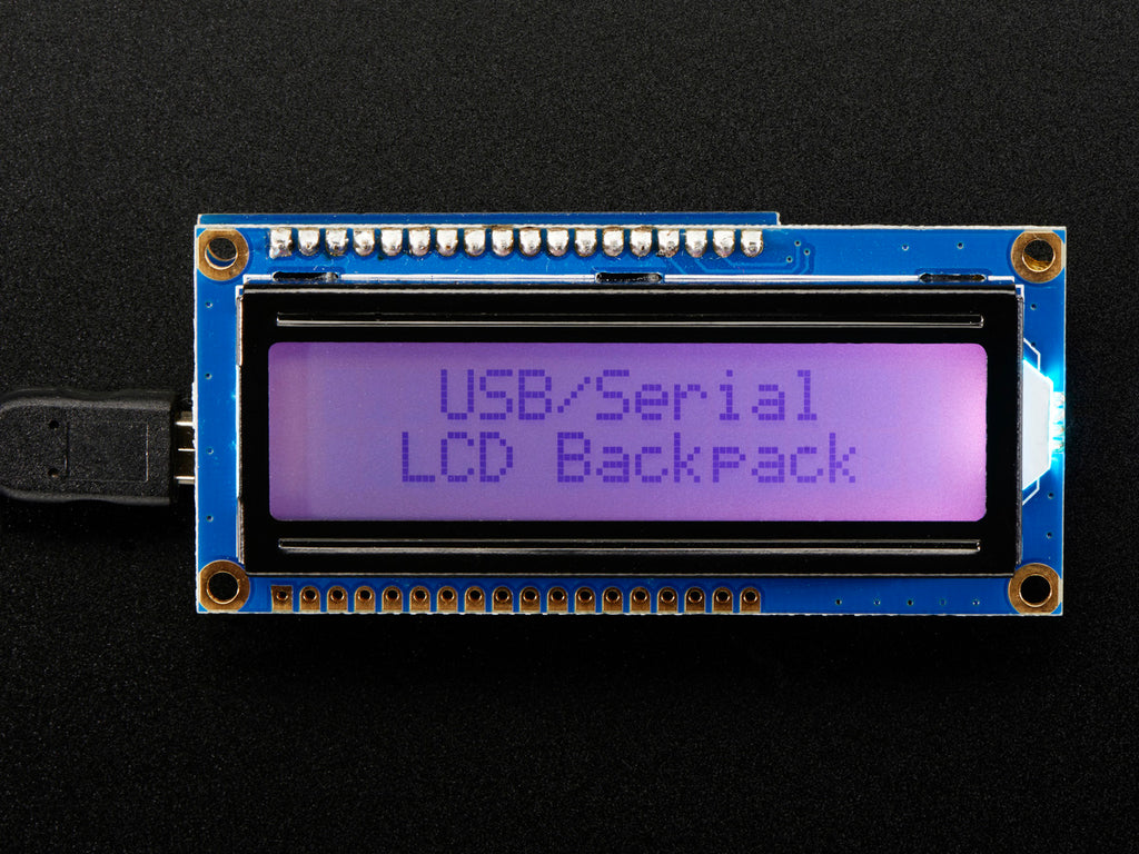 Adding a character display to your project or computer has never been easier with the new Adafruit USB or TTL serial backpack! This custom-designed PCB sits on the back of our 'standard' character LCD (16x2 or 20x4 sized) and does everything you could want: printing text, automatic scrolling, setting the backlight, adjusting contrast, making custom characters, turning on and off the cursor, etc. It can even handle our RGB backlight LCDs with full 8-bit PWM control of the backlight. That means you can change the background color to anything you want - red, green, blue, pink, white, purple yellow, teal, salmon, chartreuse, or just leave it off for a neutral background.