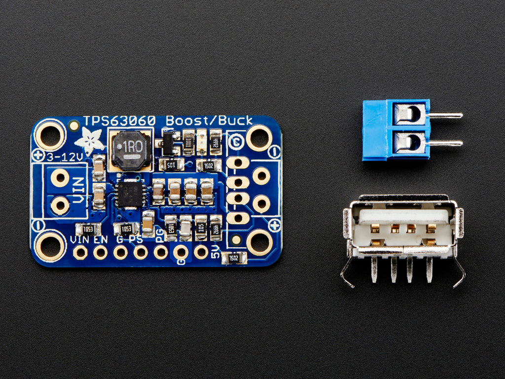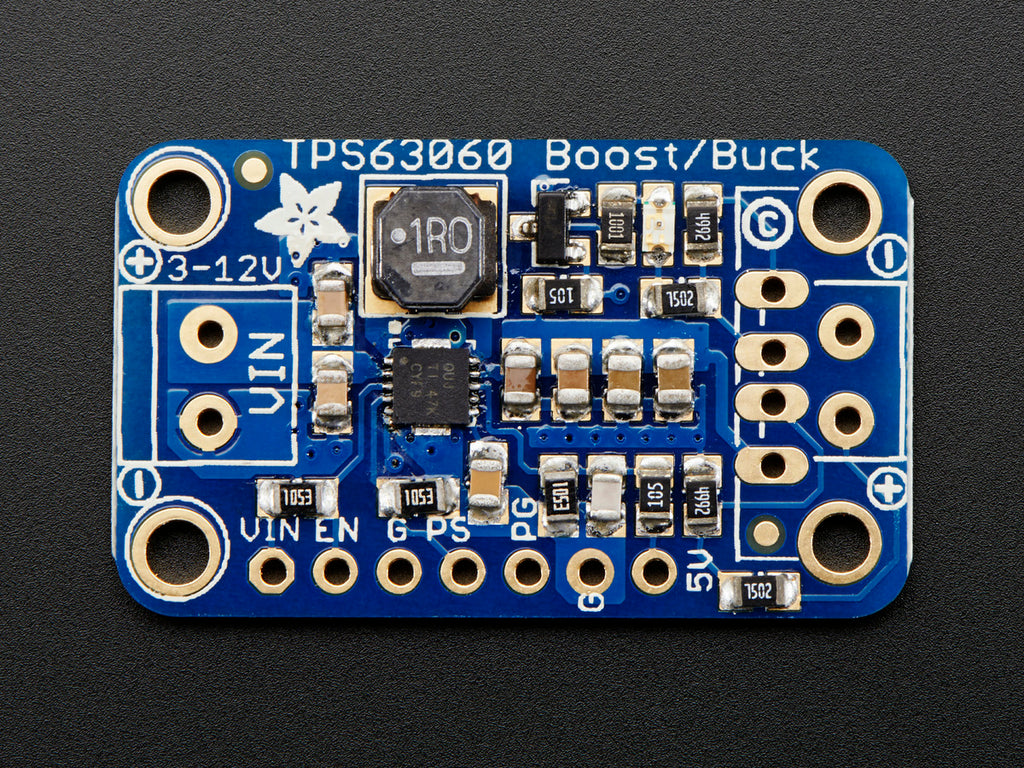 It operates smoothly over the 3-12V range, moving from a boost converter (3-5V in) to a buck converter (5-12V in) on the fly. Please note! This chip can do both, but it really works better as a buck converter than a boost. If you need a full 500mA out, it will struggle as it gets down to 3V and the output will sag to about 4.8V (which is still within standard USB power specs). If you only need something to boost a voltage up to 5V and you want it to be really good at it, check out our PowerBoost series, which excel at that.