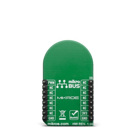 The gate of the MOSFET is driven by the PWM signal, routed to the PWM pin of the mikroBUS™ socket. The PWM signal toggles the MOSFET gate with pulses of a certain width. As a result, the current through the motor is varied depending on the pulse width of the PWM signal, which directly affects the speed of the motor, effectively controlling the vibration force that way. The circuit also contains a protection diode, which protects the transistor from the reverse voltage since the motor represents an inductive load. Turning off its current can produce a kickback voltage that can damage the transistor.