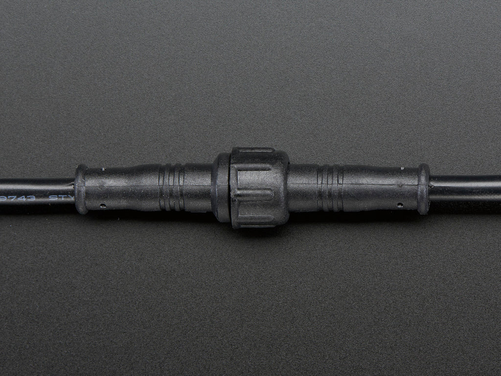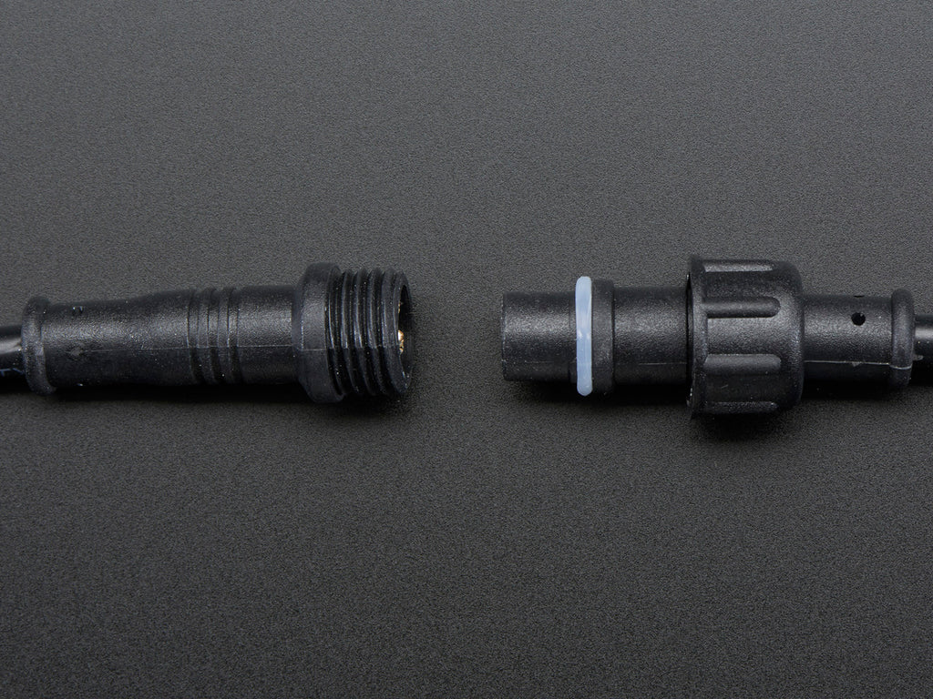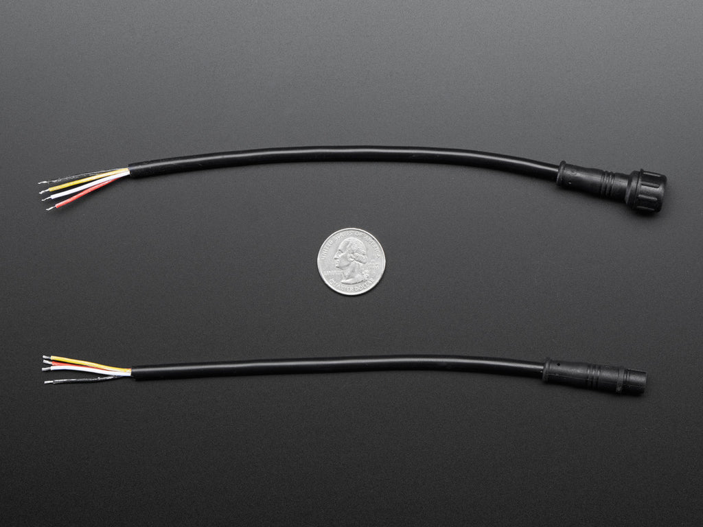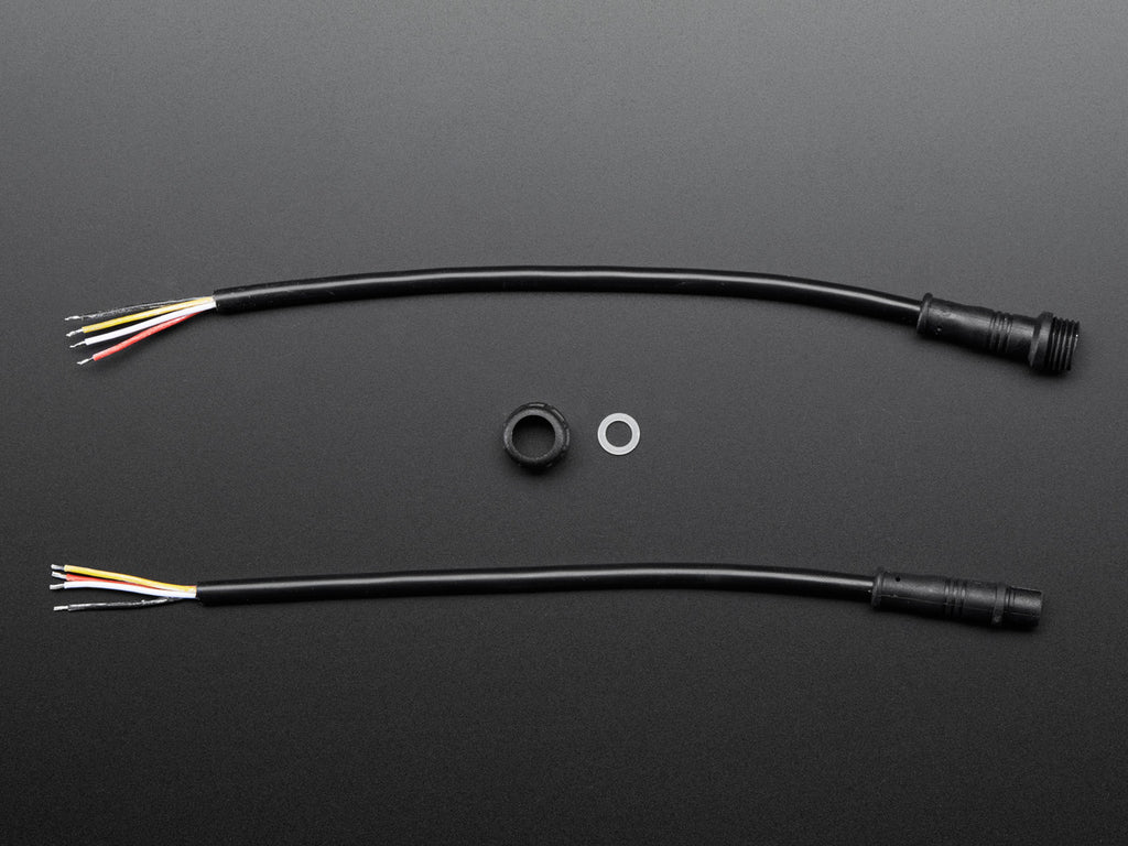 Outdoor enthusiasts rejoice! We now have very useful 4-wire polarized cable sets in a waterproof variety. These cable sets are ideal for projects that must weather the weather: dust, water, rain, snow, tornado (not volcano proof!). Each cable has 4 color-coded conductors (red, black, white yellow) that match between the sides, for easy wiring and connectors are polarized so you can't plug them in wrong. They are a little bulky the o-ring and removable over-screw. The o-ring is what makes the waterproof seal, and the over-screw keeps the two halves connected solidly