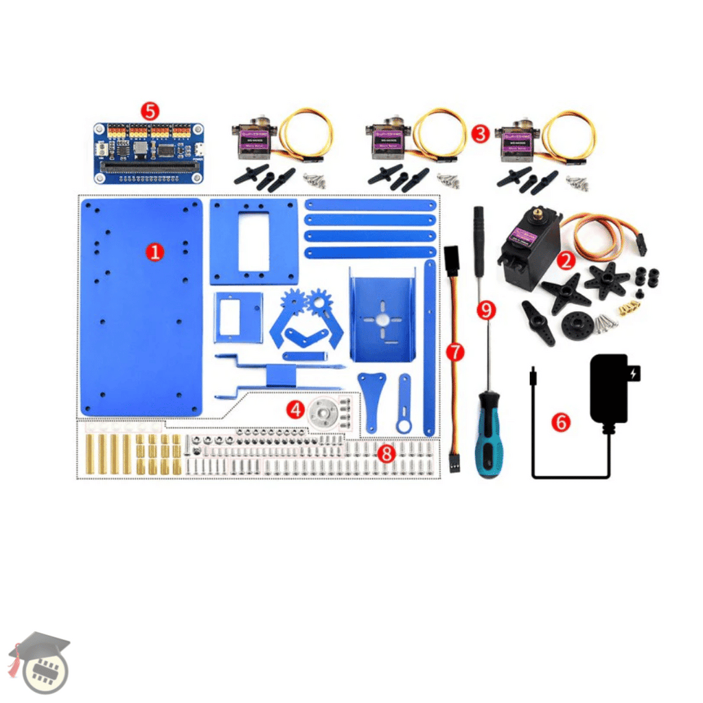 This starter robotic arm kit includes: servo driver board, metal mechanical arm structure, and 4x metal gear servos. When used with the micro:bit, it is easy to control the arm by smart phone through Bluetooth connection.