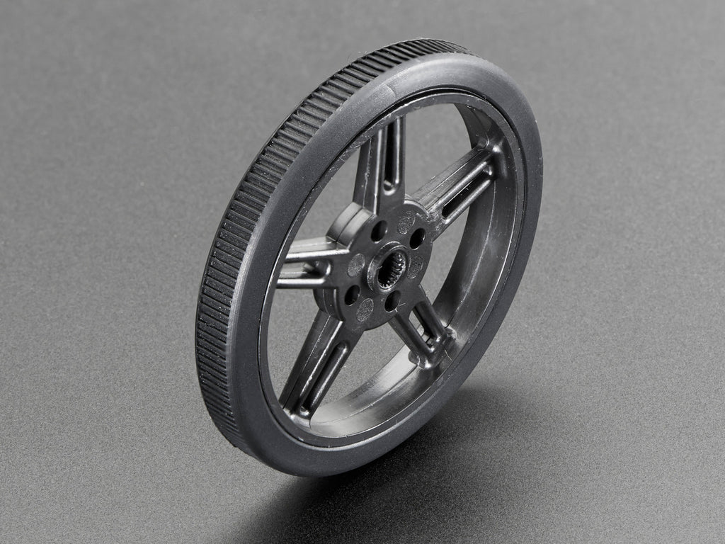 Need a great drive solution for your little robotic friends? This black plastic Micro Continuos Rotation Servo Wheel is equipped with a silicone tire and a press-fit design to make connecting to your FS90R Micro Servo super quick and easy. Make cute robots today with a couple of these wheels!
