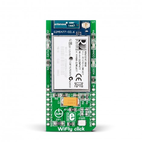WiFly Click is based on the RN-131, a standalone embedded wireless 802.11b/g/n networking module from Microchip. The RN-131 comes preloaded with software to simplify integration and minimize application development, controlled with simple ASCII commands for scanning, authenticating, and connecting to the WiFi networks. This Click board™ has many built-in networking applications, such as DHCP, UDP, DNS, ARP, ICMP, TCP, HTTP client, and FTP client. The module can achieve data rates of up to 54Mbps over an onboard chip antenna or external one through a u.Fl connector. Regarding security, this Click board™ features WEP-128, WPA-PSK(TKIP), or WPA2-PSK(AES) for WiFi authentications. Remote configuration can be made over WiFi using Telnet, although firmware can be upgraded over over-the-air (OtA).