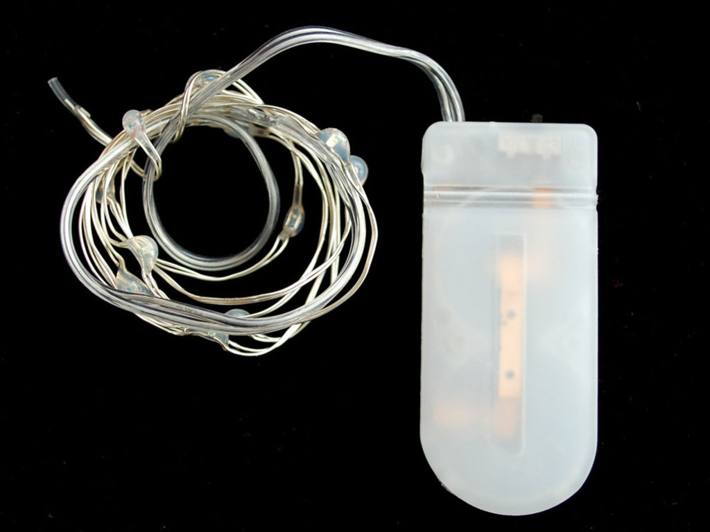 Add sparkle to your project with these lovely silver wire LED strands. These strands are very interesting, they use two silver wires that are coated so they don't short if they touch, then tiny 1000mcd LEDs are bonded onto the wires and coated with epoxy. The result is a very flexible silver wire with sparkly "fairy" lights that are much less visible than normal LEDs. They're still just LEDs, but in a fun new form-factor! They're even waterproof - you can dunk these or have them outdoors, just be sure to protect the battery holder.